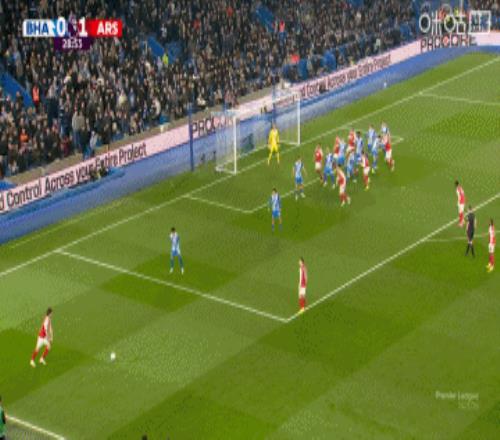 第30分鐘,阿森納前場(chǎng)左側(cè)定位球機(jī)會(huì),賴斯主罰似傳似射往門前去稍稍高出↓