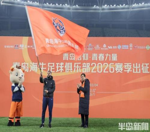 青島市人民政府副市長趙勝村在出征儀式上為海牛隊授旗出征,隊長梅薩烏迪接過大旗并用力揮舞。這標志著海牛隊2026賽季中超征程正式開啟。根據(jù)賽程,海牛新賽季首場比賽將于本月7日奔赴昆明,客場挑戰(zhàn)云南玉昆,首個主場比賽會于3月20日上演,對手是實力不俗的浙江隊。