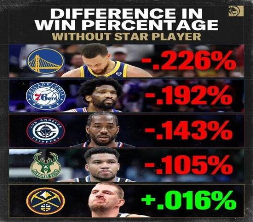 據(jù)統(tǒng)計,勇士無庫里勝率降低22.6%,快船無卡降低14.3%,掘金無約提升1.6%……