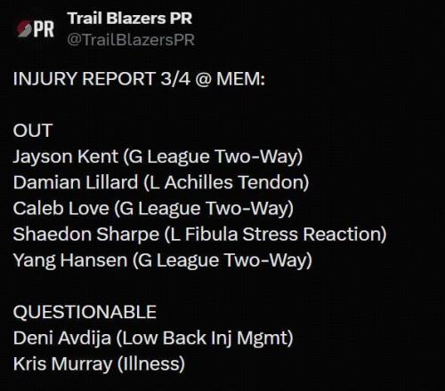 北京時間3月5日NBA常規(guī)賽,開拓者將對陣灰熊。賽前開拓者公布了本場比賽的傷病名單。