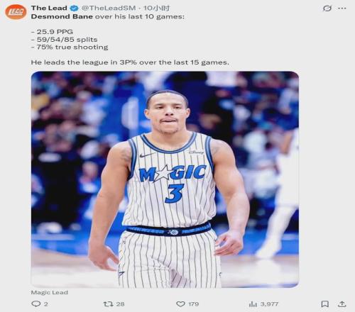 最近10場(chǎng)比賽,魔術(shù)后衛(wèi)貝恩場(chǎng)均能砍下25.9分,投籃命中率59.3%,三分命中率53.7%,罰球命中率84.9%,真實(shí)命中率高達(dá)75%。過去15場(chǎng)比賽,貝恩的三分命中率領(lǐng)跑全聯(lián)盟。截至今天賽前,魔術(shù)32勝28負(fù)暫列東部第七。