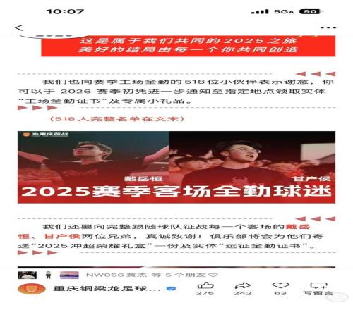 在眾多遠(yuǎn)征球迷中,重慶無(wú)名勇士球迷協(xié)會(huì)的兩名鐵桿球迷戴岳恒和甘戶(hù)侯名氣不小,因?yàn)樗麄冊(cè)?025賽季中甲聯(lián)賽完成了全部15個(gè)客場(chǎng)的加油,并獲得了由重慶銅梁龍俱樂(lè)部頒發(fā)的“2025賽季遠(yuǎn)征全勤證書(shū)”。3月6日,記者采訪了這兩名鐵桿球迷,他們都已經(jīng)訂好了去天津的機(jī)票。
