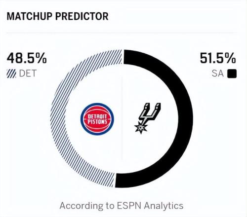 馬刺上一場(chǎng)大勝76人,過去13場(chǎng)賽事贏下12場(chǎng),以44勝17負(fù)位列西部第二,本賽季馬刺表現(xiàn)驚艷,球隊(duì)攻防效率均躋身聯(lián)盟前十,內(nèi)線文班亞馬的防守威懾力毋庸置疑,外線卡斯?fàn)?、瓦塞爾等人運(yùn)動(dòng)能力出眾,全隊(duì)防守壓迫性十足,同時(shí)多達(dá)8人場(chǎng)均得分上雙。結(jié)合兩隊(duì)現(xiàn)狀,雙方均為聯(lián)盟年輕新生力量,防守表現(xiàn)同樣出色?;钊M(jìn)攻主要依靠坎寧安帶動(dòng),但他近期狀態(tài)不算穩(wěn)定;馬刺得分點(diǎn)更為分散,兩隊(duì)上月24號(hào)首次交手,馬刺曾114-103擊敗活塞!ESPN預(yù)測(cè)本場(chǎng)比賽,馬刺勝率51.5%,活塞勝率48.5%。