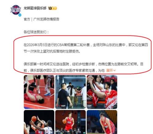 后來,廣州隊也是在第一時間公布了郭艾倫的傷情,廣州隊公告內(nèi)容表示:郭艾倫傷病位置為左膝前交叉韌帶斷了,接下來,球隊會請專家制定康復(fù)方案,給郭艾倫一個最好的康復(fù)治療。