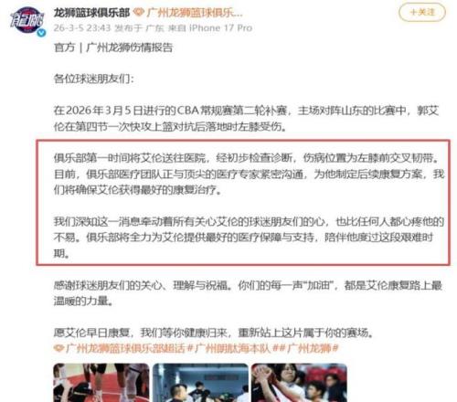 當(dāng)夜,廣州龍獅俱樂部官方通報確診結(jié)果:左膝前交叉韌帶斷裂,需接受重建手術(shù);術(shù)后系統(tǒng)性康復(fù)預(yù)計耗時8至12個月。這意味著,這位33歲的國家隊主力控衛(wèi),本賽季征程就此戛然而止。