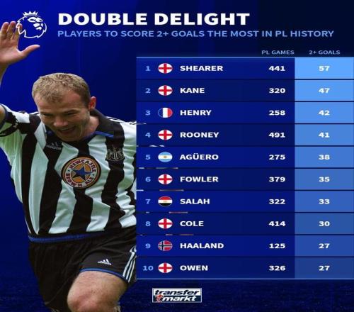 英超歷史單場(chǎng)進(jìn)球2+排行榜:希勒57場(chǎng)第1,凱恩第2,亨利第3