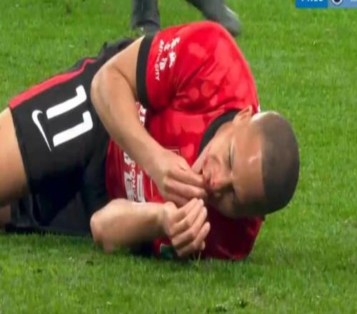 第15分鐘,姜至鵬邊線肘擊韋林頓,主裁判先是向姜至鵬出示黃牌?;乜绰R頭之后,主裁判改判紅牌。