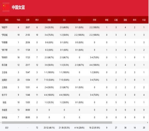 但中國隊的表現(xiàn)并不穩(wěn)定。從單節(jié)比賽看,中國隊在第二節(jié)以20比9取得絕對優(yōu)勢,但其余三節(jié)表現(xiàn)一般,在下半場兩節(jié)更是以14比16、14比18全面落后。尤其是在第四節(jié)劉禹彤和張子宇都顯得體力不支的情況下,內(nèi)外線失去穩(wěn)定得分點,場面一度略顯被動。