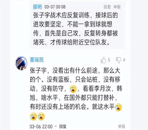 昨晚她與同位置的劉禹彤打的時間一樣多的13分鐘,但她的得分比劉禹彤少6分,籃板比劉禹彤少4個,而失誤卻比劉禹彤多了3個。張子宇在場對球隊傷害很大,特別是下半場張子宇在場時,拖累了中國隊的攻防體系!第四節(jié)上半段打得太難看了,她目前水平還未達(dá)到國家隊要求。最近兩場熱身賽她都被劉禹彤搶了風(fēng)頭。