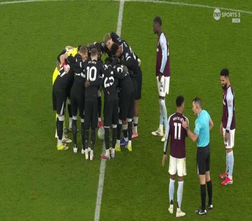 本場比賽下半場開始前,切爾西球員齊聚中圈,將球圍在中間,并用腳撥弄足球并集體喊話,這一行為直接導致比賽開球時間被迫推遲。