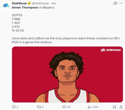 數據媒體曬出阿門這場比賽的數據后寫道:阿門與約基奇、勒布朗一同成為本世紀僅有比賽命中率超過90%還能達成26+7+7+2搶斷的球員。