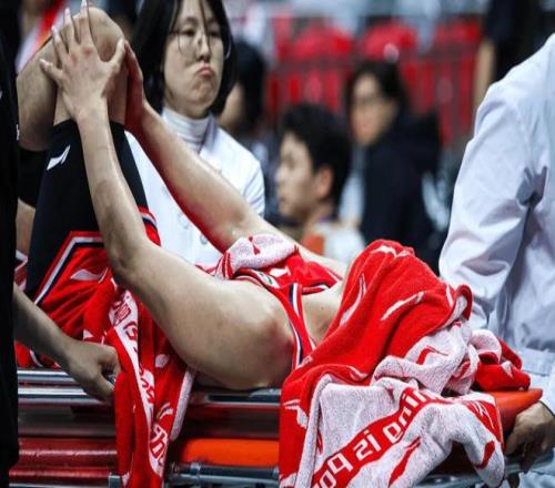 倒下后的他,蜷縮在地板上許久,最終被擔(dān)架抬出賽場(chǎng)。