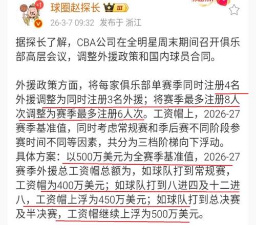 此外,在外援的工資方面,也是進(jìn)行調(diào)整,本賽季,外援的總工資帽為500萬美元,下賽季,將會調(diào)整到400萬美元。當(dāng)然了,還會設(shè)置一些浮動,季后賽進(jìn)入八強(qiáng)的球隊(duì),外援總工資帽調(diào)整到450萬美元;闖進(jìn)CBA總決賽的球隊(duì),外援總工資帽調(diào)整到500萬美元。