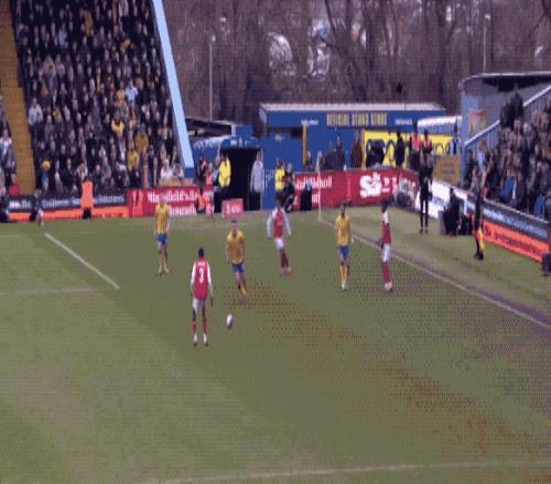 穩(wěn)住陣腳后,阿森納開(kāi)始控制局面,利用嫻熟的傳控球撕扯曼斯菲爾德的防線。第20分鐘,特羅薩德卯足全力的射門,放了高射炮。