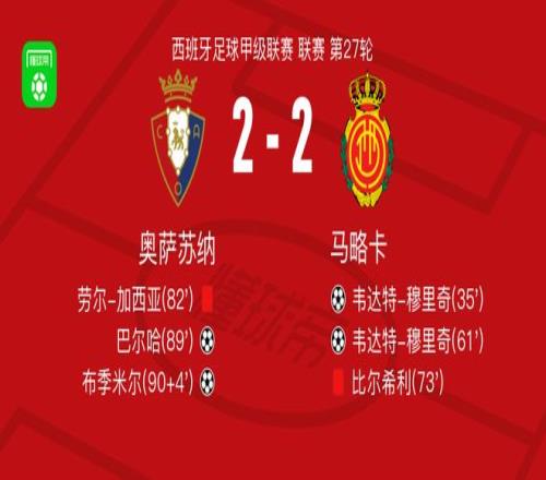 北京時間3月7日西班牙足球甲級聯(lián)賽 聯(lián)賽 第27輪,奧薩蘇納主場對陣馬略卡。奧薩蘇納巴爾哈破門,布季米爾破門。馬略卡韋達(dá)特-穆里奇梅開二度。最終比分奧薩蘇納 2-2 馬略卡。