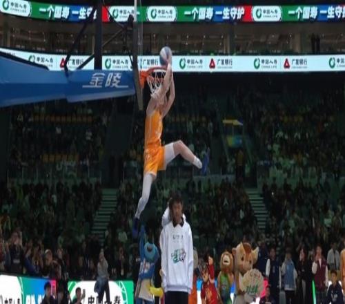 第4位出場(chǎng)的是廣州球員張文杰,他完成底線加速拉桿雙手反扣得到46分。