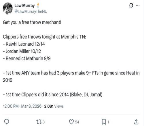 同時(shí)快船隊(duì)全場3人至少獲得9次罰球,也成為19年以來聯(lián)盟首隊(duì),更是14年來快船隊(duì)首次,上次還要追溯到格里芬、小喬丹和克勞福德時(shí)期。
