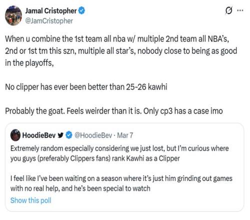 快船隊(duì)記Jamal Cristopher就稱贊到:“小卡曾多次入選一陣、二陣,本賽季同樣有望入選,加上多次全明星與季后賽出色的表現(xiàn),快船隊(duì)史沒有哪個(gè)球員能夠比得上本賽季的小卡?!?/p>