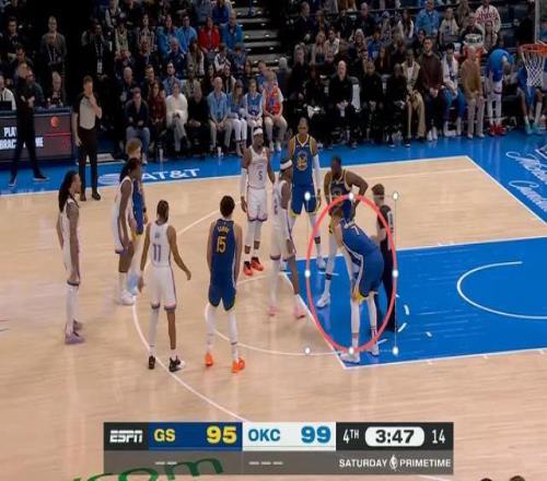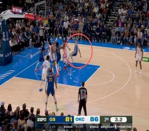 今天波神在場上,勇士一般會安排他打低位,雷霆今天切特和哈騰都不打,雷霆一般都會安排小個后衛(wèi)去錯防波神,隨時準(zhǔn)備包夾。在單打小個的時候,波神也很難展現(xiàn)出碾壓級的背身優(yōu)勢,一般都是頂個一兩下然后轉(zhuǎn)身投籃。