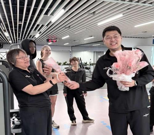 另一邊,俱樂部杯賽區(qū)訓(xùn)練場里,北京首鋼園女籃主教練李翔也將鮮花送到了女籃姑娘們手中。