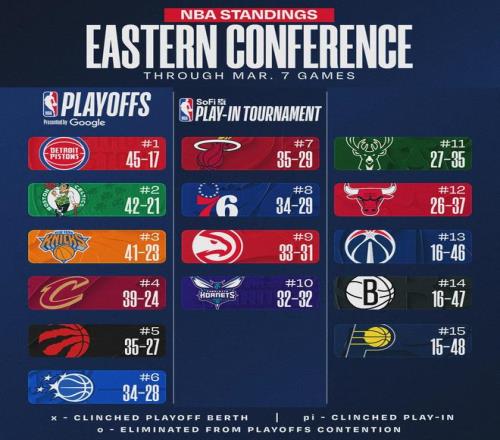 從2月中旬到3月3日,活塞長達(dá)三周占據(jù)聯(lián)盟第一的位置。隨著此次遭遇3連敗,活塞直接從聯(lián)盟第一變成了第三。今天另外兩場比賽:雷霆104-97擊敗勇士,雷霆成為本賽季首支50勝球隊(duì);森林狼92-119慘敗魔術(shù),跌至西部第四。