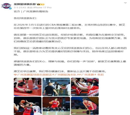 檢查結(jié)果顯示,郭艾倫遭遇左膝前交叉韌帶撕裂。