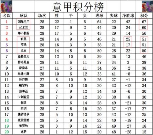積分榜方面,AC米蘭今天擊敗國米后,多少還是挽留了些爭冠懸念,將和國米的分差拉回到個(gè)位數(shù),10輪追7分還是有機(jī)會的。那不勒斯差國米11分排在第3。爭四很激烈,黑馬科莫凈勝球優(yōu)勢力壓羅馬位列前4,尤文1分之差排在第5。