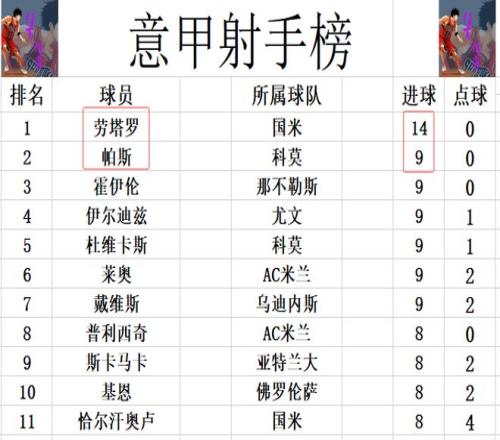 射手榜方面,還是勞塔羅14球領(lǐng)跑,帕斯,萊奧,伊爾迪茲,杜維卡斯,霍伊倫等人9球并列第2。普利西奇今天沒有進(jìn)球,還是和斯卡馬卡,基恩,恰爾汗奧盧等人8球剛好擠入前十。