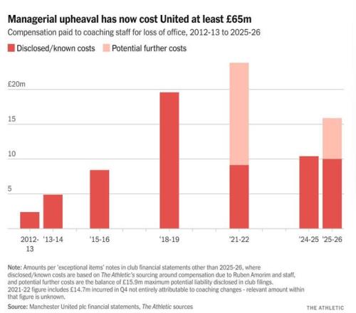 對(duì)財(cái)務(wù)狀況而言,或許更重要的是繼續(xù)聘用以及——這在足球界很可能發(fā)生,尤其是在近期的曼聯(lián)——最終解雇卡里克需要花費(fèi)多少。就像球員薪水一樣,主教練的薪水從未可靠地公開過,但可以合理地認(rèn)為,如果他留在老特拉福德教練席,俱樂部花費(fèi)會(huì)比聘請(qǐng)一位更受追捧、名氣更大的人物要少。相應(yīng)地,如果事情進(jìn)展不順,解雇他的成本也會(huì)更低。一月初解雇阿莫林及其教練組,使曼聯(lián)面臨最高1590萬英鎊的和解賠償金,這與近年來一系列類似的支出相當(dāng)。解雇滕哈格花費(fèi)了1040萬英鎊;三年前解雇索爾斯克亞花費(fèi)了910萬英鎊;2018年12月解雇若澤-穆里尼奧花費(fèi)了1960萬英鎊——這是俱樂部歷史上支付給主教練的最高和解金。