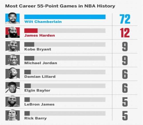 除了人們熟知的單場(chǎng)100分,張伯倫還曾在72場(chǎng)比賽里至少得到55分,歷史第二的哈登只有12場(chǎng)。