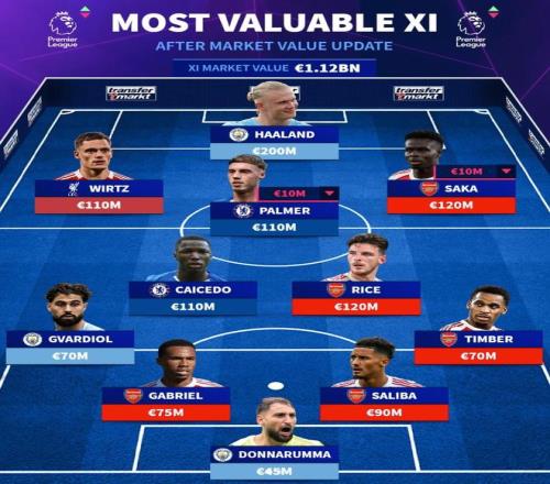 薩卡(阿森納)1.2億歐元、哈蘭德(曼城)2億歐元、維爾茨(利物浦)1.1億歐元