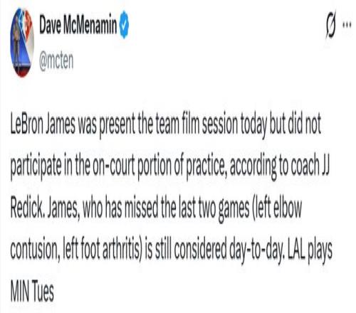 詹姆斯因左肘挫傷、左腳關(guān)節(jié)炎已經(jīng)連續(xù)缺陣兩場比賽,目前仍處于每日觀察狀態(tài)。雷迪克還表示,球隊(duì)在訓(xùn)練中重點(diǎn)打磨了一些細(xì)節(jié),尤其是擋拆防守和無球掩護(hù)。