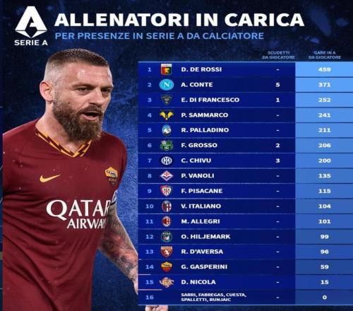 北京時間3月10日,德轉(zhuǎn)統(tǒng)計出了意甲20家俱樂部現(xiàn)任主帥球員生涯的意甲出場數(shù)排名,熱那亞主帥德羅西以459場排名第一,那不勒斯主帥孔蒂371場第二。
