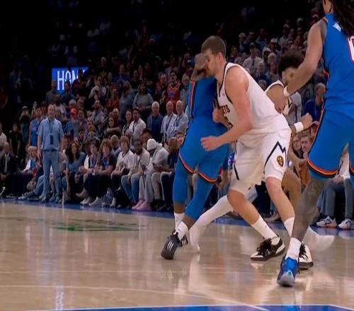 比賽還剩1分12秒,雷霆領(lǐng)先7分,懸念看似結(jié)束,但實則這比賽真正精彩的部分才剛剛開始。多爾特在一次擠掩護的時候,左手出現(xiàn)在了不應(yīng)該出現(xiàn)的位置,直接打到約基奇的面門,裁判回看之后吹了一次惡意犯規(guī),掘金兩罰一擲。