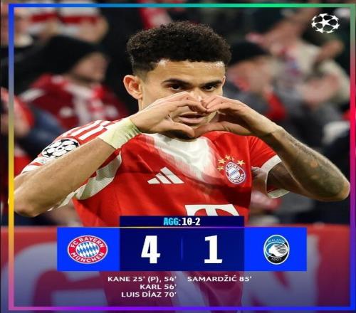 凱恩在第25分鐘點(diǎn)球破門,拜仁取得1-0的領(lǐng)先。下半場(chǎng)比賽開場(chǎng)不久,凱恩梅開二度擴(kuò)大了領(lǐng)先優(yōu)勢(shì)。此后卡爾和迪亞茲又先后取得進(jìn)球,拜仁4球領(lǐng)先對(duì)手。第85分鐘薩馬爾季奇為亞特蘭大打入挽回顏面的進(jìn)球。最終兩回合比賽戰(zhàn)罷,拜仁10-2大勝亞特蘭大。