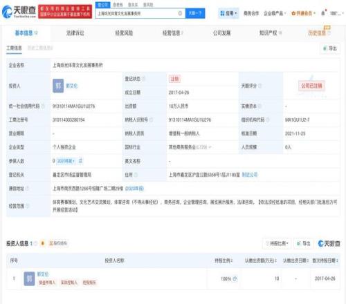 天眼查工商信息顯示,上海爍光體育文化發(fā)展事務(wù)所成立于2017年4月,出資額10萬人民幣,經(jīng)營范圍含體育賽事策劃、文化藝術(shù)交流策劃、體育咨詢等,為郭艾倫個人獨資企業(yè)。目前該事務(wù)所已注銷。