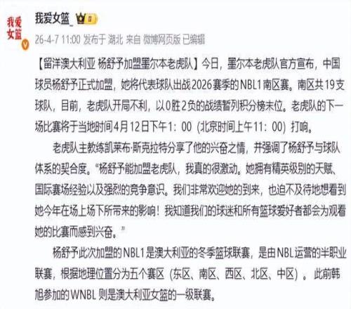 北京時(shí)間4月7日消息,中國(guó)女籃新任隊(duì)長(zhǎng)楊舒予,正式加盟澳大利亞NBL1南區(qū)聯(lián)賽墨爾本老虎隊(duì),開啟個(gè)人職業(yè)生涯的首次留洋之旅。這一舉動(dòng),不僅標(biāo)志著她從WCBA冠軍核心邁向國(guó)際舞臺(tái)的跨越,更向世界宣告:中國(guó)女籃的未來,正由一位兼具天賦、智慧與領(lǐng)袖氣質(zhì)的年輕隊(duì)長(zhǎng)所定義。