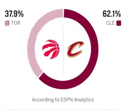 ESPN預(yù)測本場比賽勝率:騎士62.1%,猛龍37.9%。