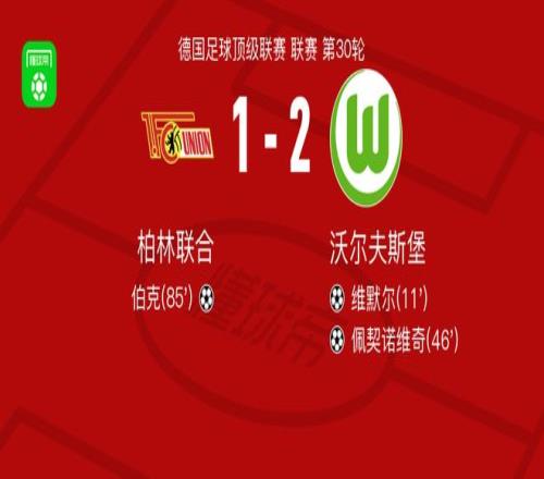 北京時(shí)間4月18日德國足球頂級(jí)聯(lián)賽 聯(lián)賽 第30輪,柏林聯(lián)合主場對(duì)陣沃爾夫斯堡。柏林聯(lián)合伯克破門。沃爾夫斯堡維默爾破門,佩契諾維奇破門。最終比分柏林聯(lián)合 1-2 沃爾夫斯堡。