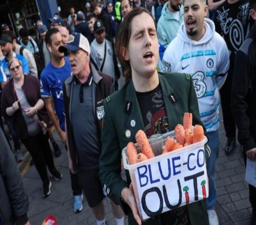 切爾西球迷手持胡蘿卜抗議BlueCo,它象征著“空頭支票”