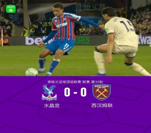 北京時間4月21日英格蘭足球頂級聯(lián)賽 聯(lián)賽 第33輪,水晶宮主場對陣西漢姆聯(lián)。最終比分水晶宮 0-0 西漢姆聯(lián)。