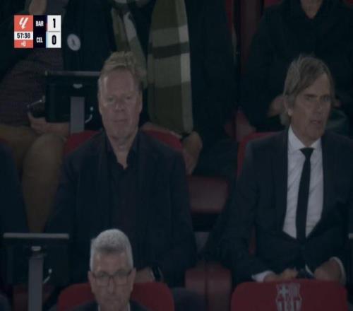 西甲第33輪,巴塞羅那主場對陣塞爾塔,巴薩隊史兩位荷蘭傳奇羅納德-科曼、科庫現(xiàn)身諾坎普看臺,現(xiàn)場觀看比賽。