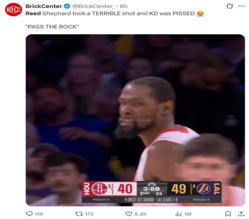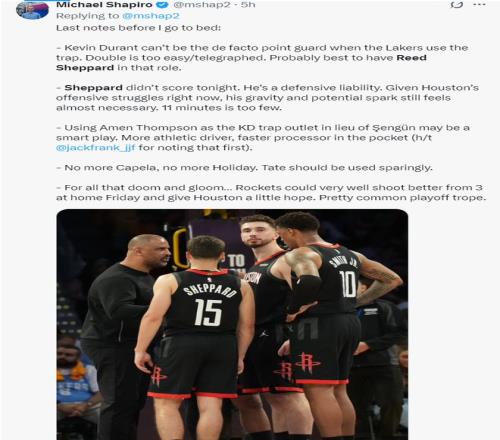 火箭隊(duì)記邁克爾0沙普爾寫道:湖人采取包夾杜蘭特的戰(zhàn)術(shù),而火箭用KD當(dāng)主要控球手,KD破包夾的能力不足,我覺得不如給謝潑德更多持球的角色。