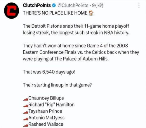 而憑借本場(chǎng)比賽主場(chǎng)取勝,活塞順利終結(jié)季后賽主場(chǎng)的11連敗紀(jì)錄;而他們上一次在底特律主場(chǎng)贏球,已經(jīng)要追溯到2008年季后賽,主場(chǎng)擊敗凱爾特人的比賽了。
