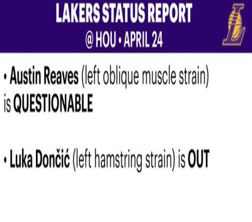 北京時(shí)間4月24日,湖人目前總比分2-0領(lǐng)先火箭,官方更新了G3的傷病報(bào)告。好消息是里夫斯(左側(cè)腹外斜肌拉傷)的狀態(tài)升級(jí)為出戰(zhàn)成疑,G3有望復(fù)出。東契奇繼續(xù)被列為缺戰(zhàn)狀態(tài),籠罩球隊(duì)的最大疑問依舊沒變:東契奇何時(shí)復(fù)出?