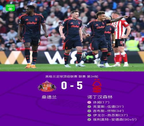 北京時(shí)間4月25日英格蘭足球頂級(jí)聯(lián)賽 聯(lián)賽 第34輪,桑德蘭主場(chǎng)對(duì)陣諾丁漢森林。桑德蘭休姆自擺烏龍。諾丁漢森林克里斯-伍德破門,吉布斯-懷特破門,伊戈?duì)?熱蘇斯破門,埃利奧特-安德森破門。最終比分桑德蘭 0-5 諾丁漢森林。