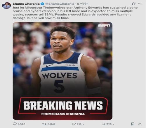 北京時間4月27日凌晨,據(jù)NBA名記Shams報道,愛德華茲確診左膝骨挫傷和過度伸展,將缺席數(shù)周!森林狼和掘金的系列賽最晚5月3日結束(G7),也就是一周之后,華子肯定趕不上了。另一個森林狼球員迪溫琴佐,因跟腱撕裂賽季報銷。